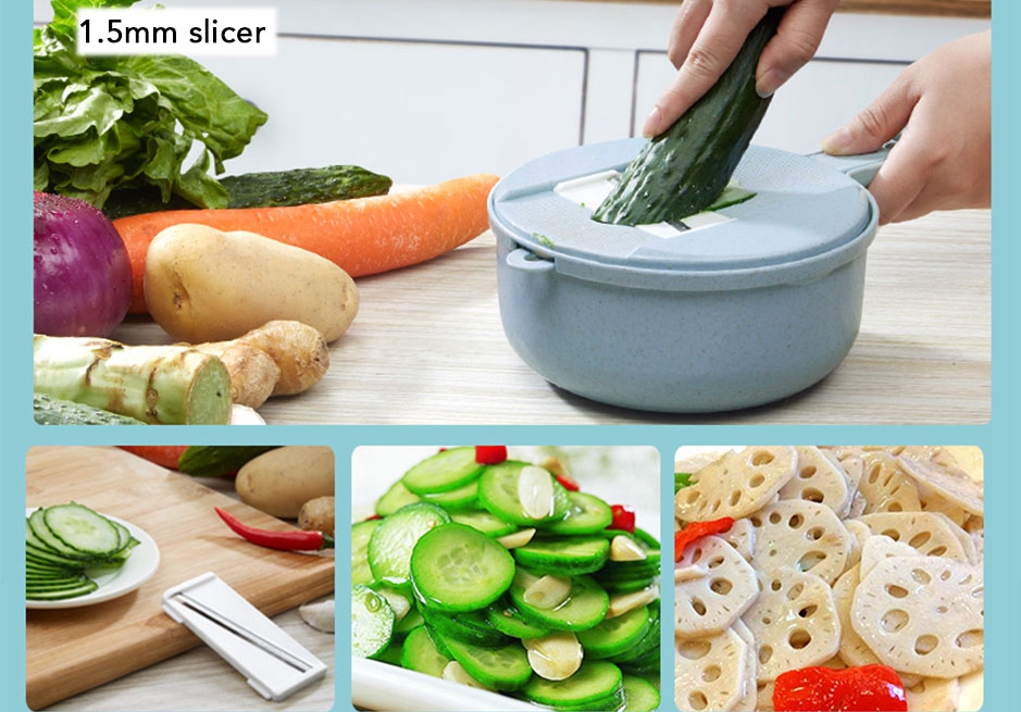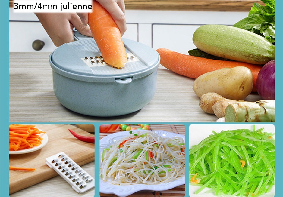 The set has many functions, including grating, slicing, serving as a juicer, storage basket and so forth.